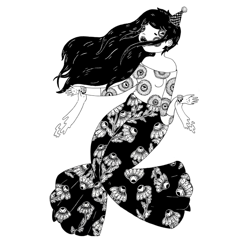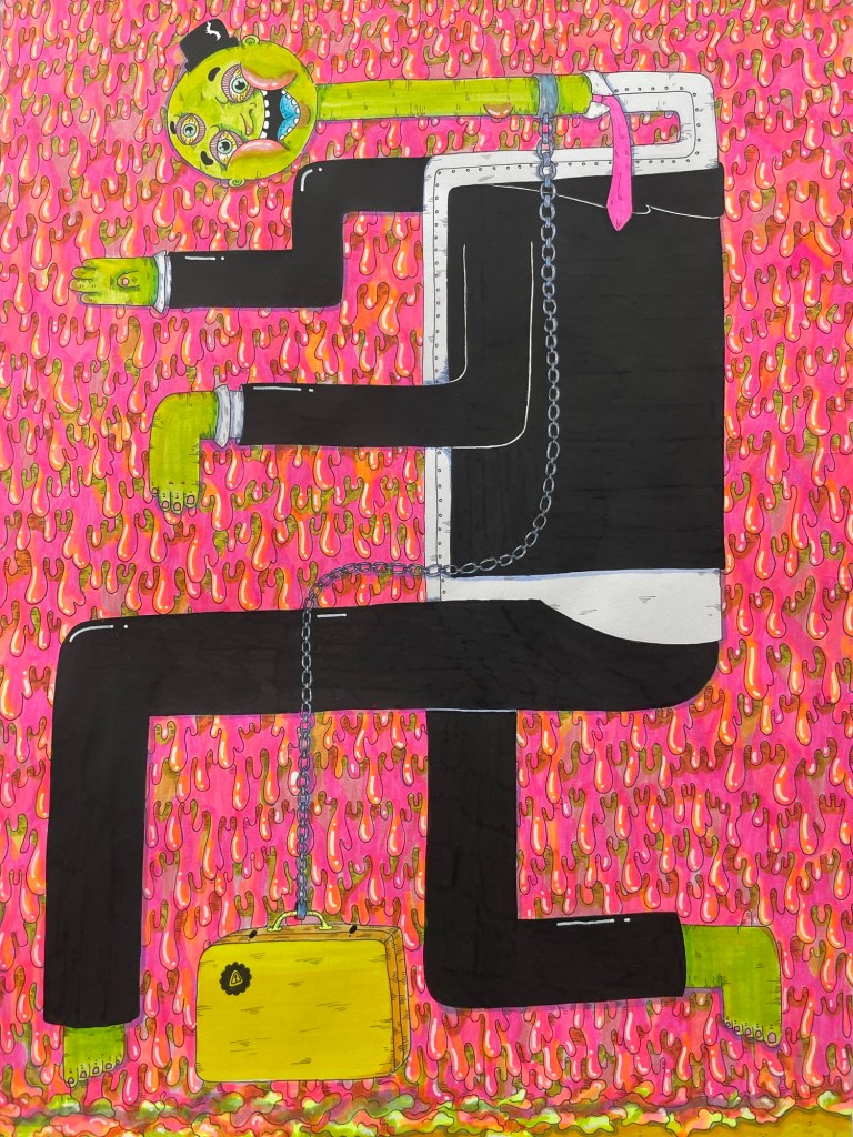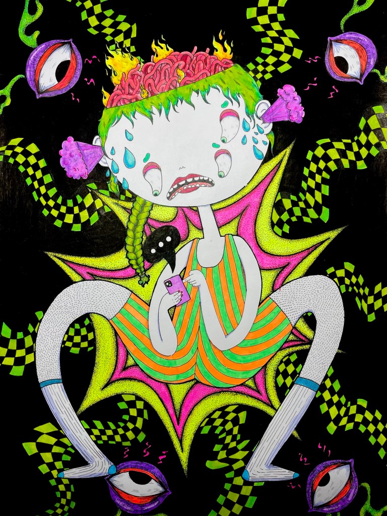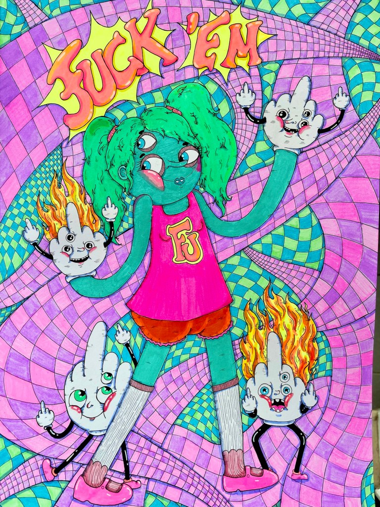 Illustrations made while listening to a song on repeat, on A3 format, with black ink and neon highlighters.