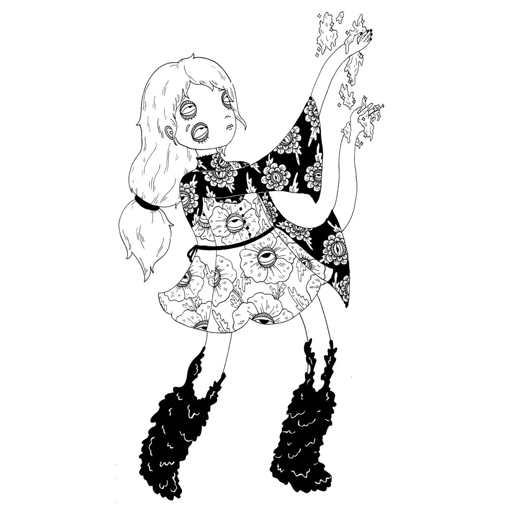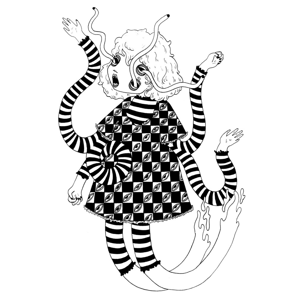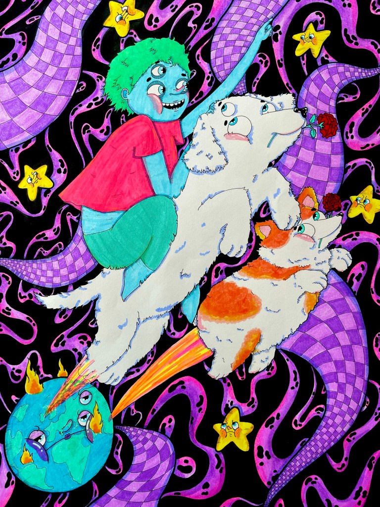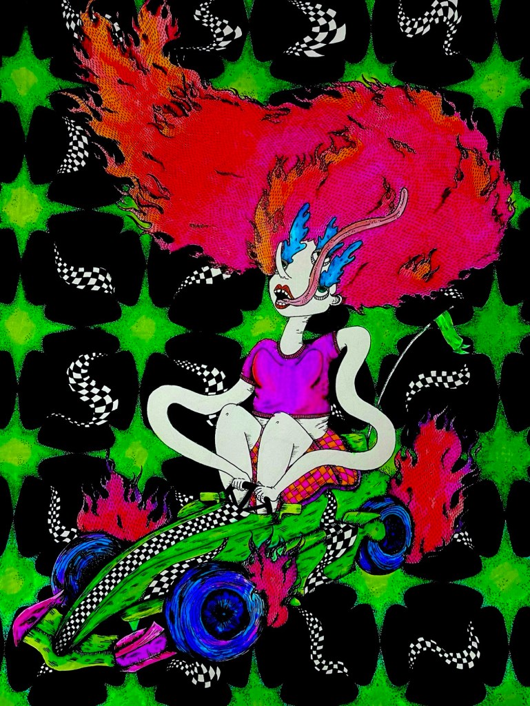 Illustrations made while listening to a song on repeat, on A3 format, with black ink and neon highlighters.